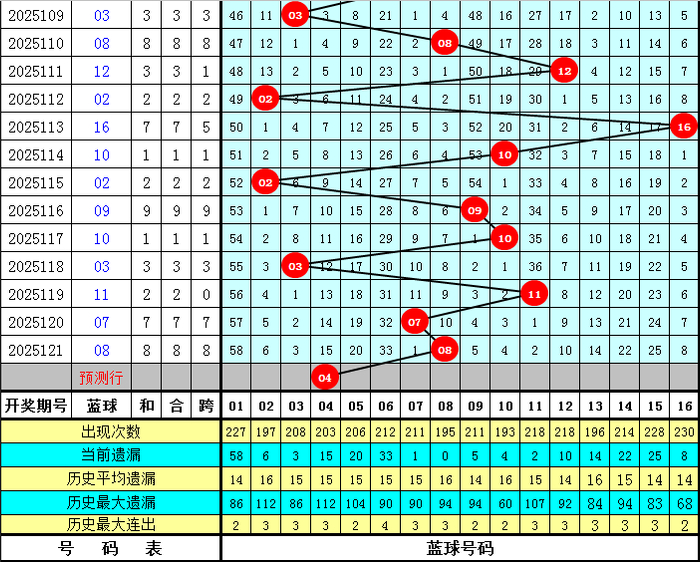 蓝球:上期蓝球号码为08,开出小 号、偶数,蓝球最近7期大小比为3:4,本期防备小 号蓝球出现,蓝球柔柔04。