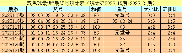 开奖回归:双色球第2025121期奖号为:06 08 10 25 29 30 + 08,红球和值为108,奇偶比为2:4,大小比为3:3。蓝球开出偶数。